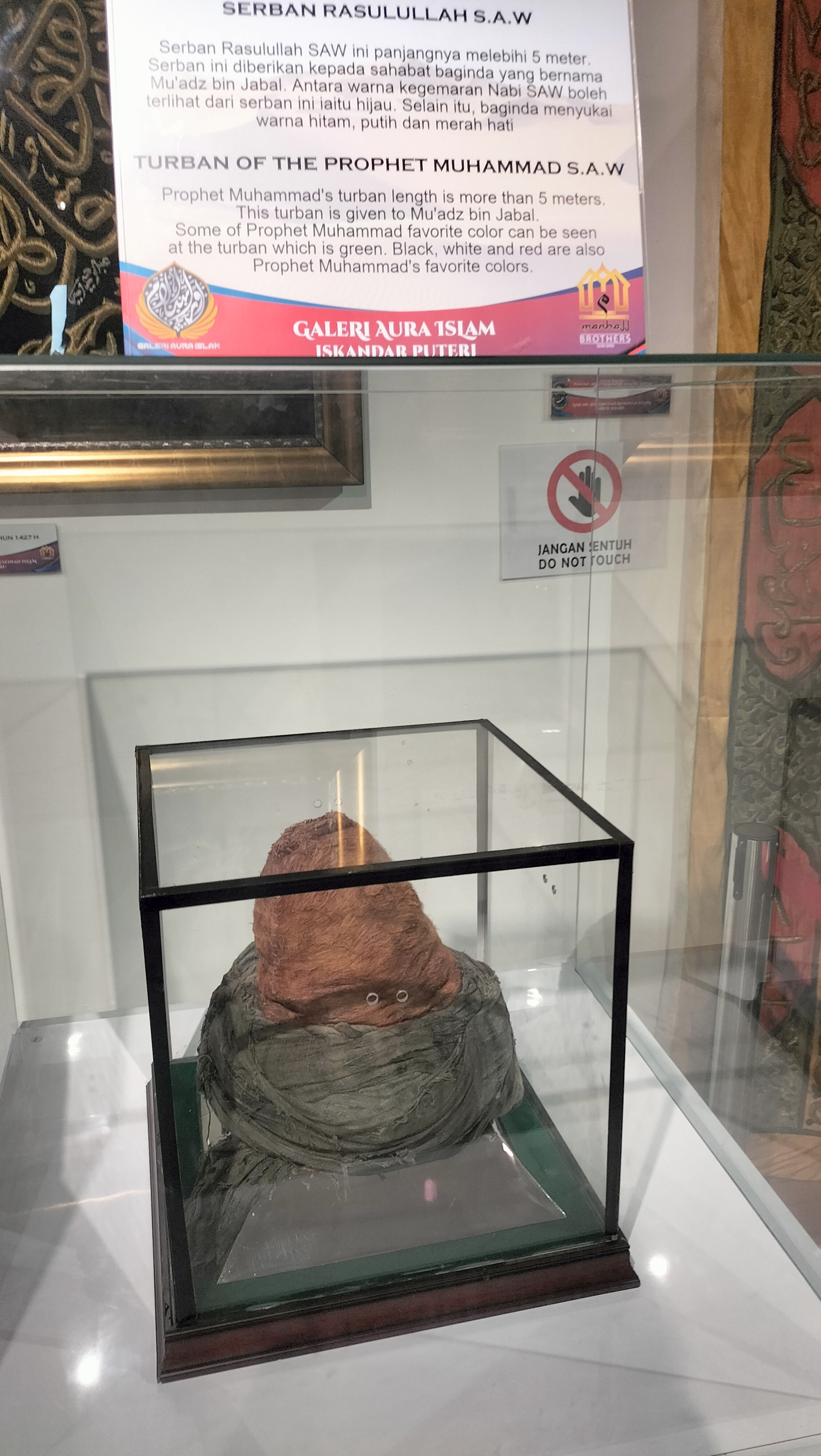 Sorban atau penutup kepala ini tampak lebih besar dari ukuran kepala manusia saat ini. Warnanya sendiri merupakan warna kesukaan nabi yakni hijau.