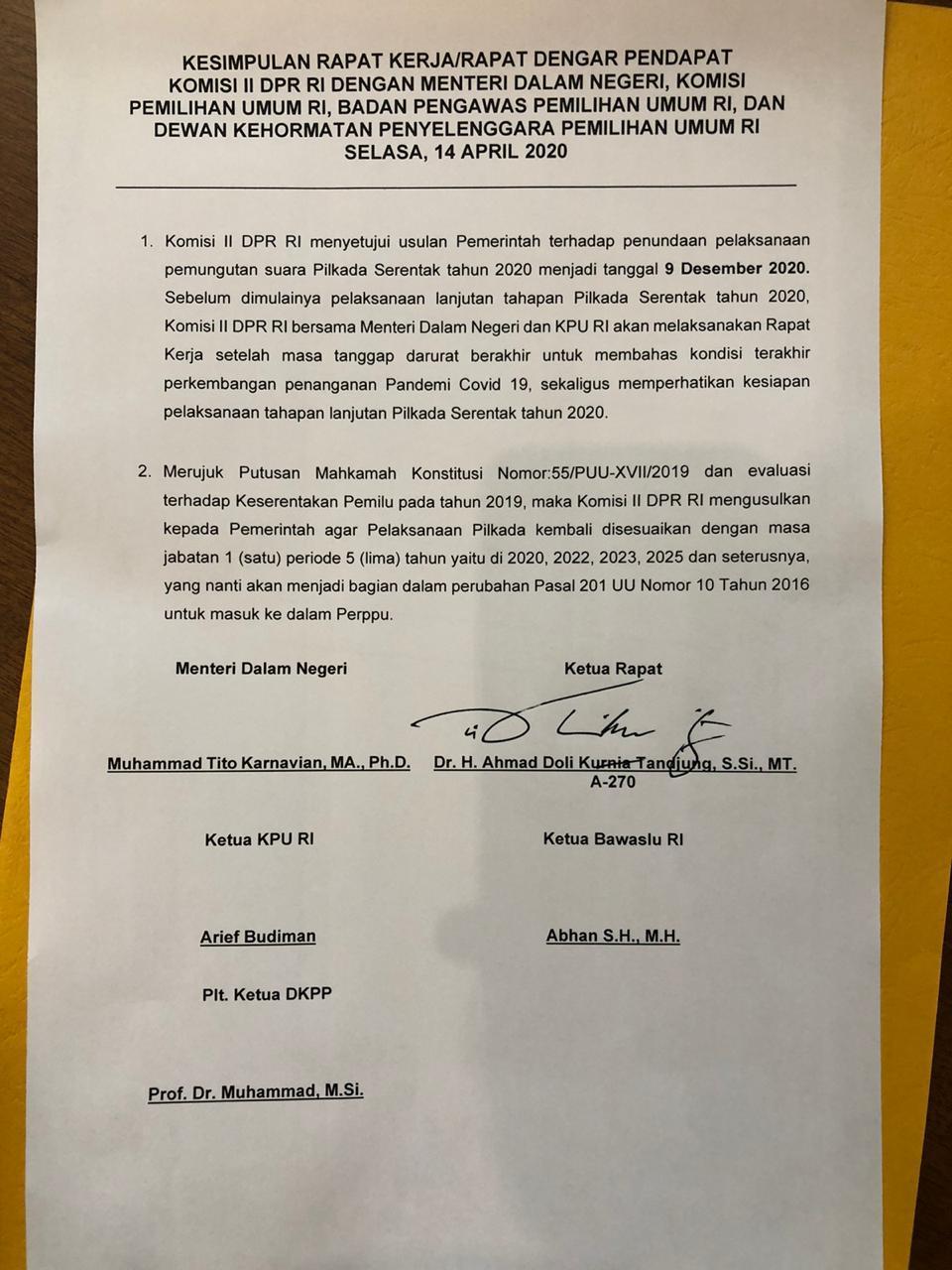 Sebelumnya, KPU, Bawaslu, DPR dan Pemerintah memang telah menyepakati jika pelaksanaan Pilkada 2020 ditunda, dalam kesepakatan tersebut ada 3 opsi pelaksanaan lanjutan pilkada serentak, yaitu Desember 2020, Maret 2021 serta September 2021.